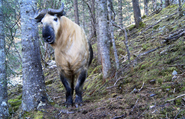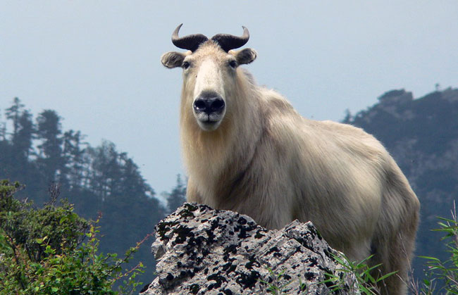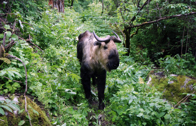 羚牛屬于國家一級保護動物,體長170-220厘米;肩高100-130厘米;尾長15-20厘米;重量250-400公斤。雄性和雌性均具較短的角,角呈扭曲狀,一般長約20厘米。頭如馬、角似鹿、蹄如牛、尾似驢其體型介于牛和羊之間,但在牙齒、角、蹄子等更接近羊,可以說是超大型的野羊。羚牛大多生活在海拔2,000-4,500米的竹林中,它們主要以草、樹葉及花蕾為食,一般在白天活動。冬天組成小規模的種群,夏天時種群數量可擴充到100頭以上,年長的公羚牛則基本為獨居。