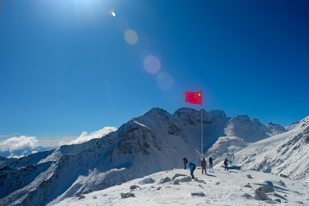 看著雪山之巔飄揚的五星紅旗,敬畏感自豪感油然而生。