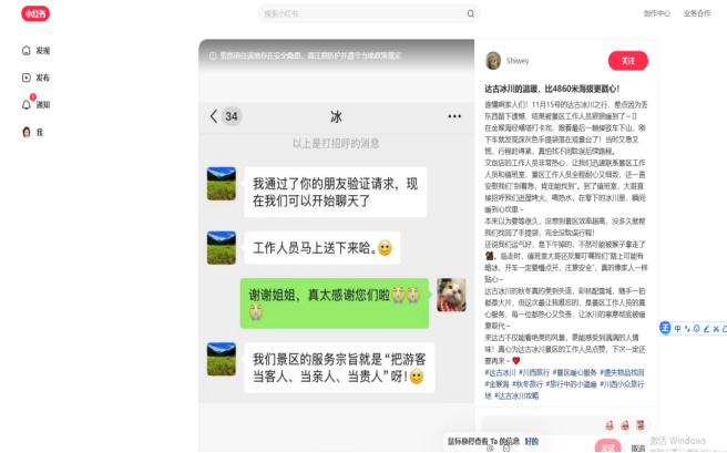 從快速響應(yīng)失物尋找,到寒冬里的暖心照料,再到細(xì)致的出行提醒,達(dá)古冰川景區(qū)以游客需求為核心,用實(shí)打?qū)嵉馁N心服務(wù),讓游客在欣賞絕美風(fēng)光的同時(shí),更感受到家人般的關(guān)懷,成為旅途最溫暖的注腳。